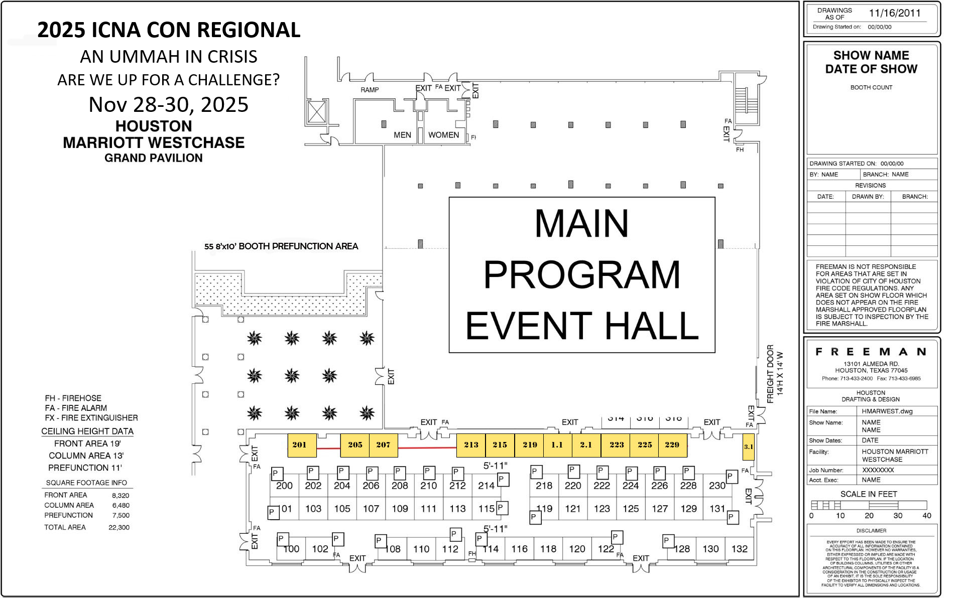 The diagram below describes the floor plan for the convention and shows all booth locations at the venue. Once you've picked out which booth(s) you like, check the listings below to see if they're still available. Please note that booths marked in red may not be purchased and are reserved for official ICNA use only.